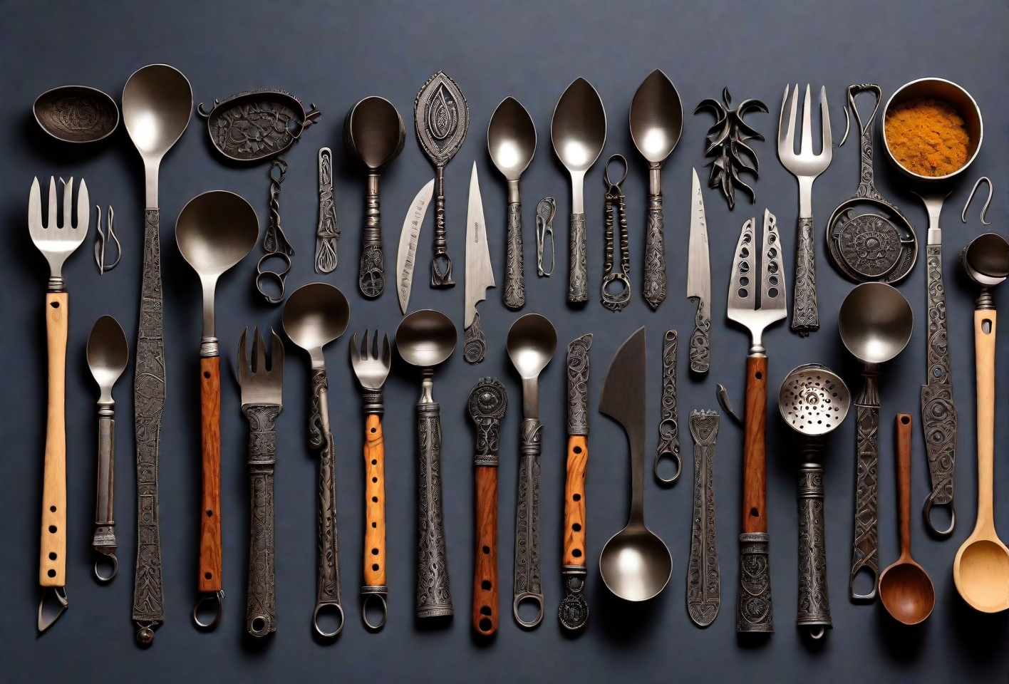 In an Indian kitchen, you'll encounter a diverse array of utensils designed for specialized tasks. A Tawa or Tava is primarily used for making flatbreads like chapatis and parathas and is often made of cast iron or non-stick materials. Pressure cookers, usually made of stainless steel or aluminum, are indispensable for cooking lentils, rice, and meat, significantly reducing cooking time. The Kadai, similar to a wok, is versatile and used for deep frying, sautéing, and making curries. Handis, traditionally made of clay but also available in metal, are employed for slow-cooking dishes like biryanis and pulaos. For rolling out dough for flatbreads, a Belan or rolling pin and a Chakla or rolling board, usually made of wood, are essential. Mortar and pestles are used for grinding spices and herbs, and they come in various materials like stone, wood, or ceramic. South Indian cuisine often requires an Idli Steamer for making steamed rice cakes and a special Dosa Pan for making dosas. A Puri Press, typically made of stainless steel or cast iron, is used to flatten dough for making puris. For storing everyday spices, a Masala Dabba or spice box, usually made of stainless steel, is quite handy. Tongs, known as Chimta, are often used for handling hot pots and pans, as well as for flipping rotis. Sieves made of stainless steel or plastic are used for sifting flours and straining liquids, while a Jhara or skimmer, is used for draining excess oil from fried foods.